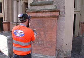 Nel primo sopraluogo effettuato si è constatato che la base della colonna interessata alle scritte non era in mattoni faccia a vista fugati, ma vi era un leggero strato d’intonaco colorato a copertura dei laterizi. Inoltre su un’altra base in facciata, sempre intonacata, vi erano antiestetiche ed estese alonature lasciate da un precedente rimozione eseguita con solventi. Bisognava agire togliendo solo le scritte spray senza intaccare l’intonaco. Operazione difficoltosa visto il ridotto spessore, la vetustà e il leggero degrado dell’intonaco. Si è optato quindi d’intervenire attraverso una pulitrice a secco dotata di pistola a getto fine e rotatorio (adatta per la monumentalità) che permettesse una precisa calibrazione di aria e inerte.